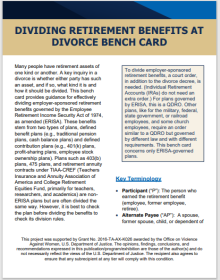 A retirement benefit can be a major asset in a divorce and may be the key to providing financial security to a domestic violence survivor. To effectively divide this asset, though, federal and state provisions must be complied with. This bench card provides an overview of the key points a judge needs to know, including the information needed to divide retirement benefits appropriately, decisions the judge needs to make, and what the order should include.