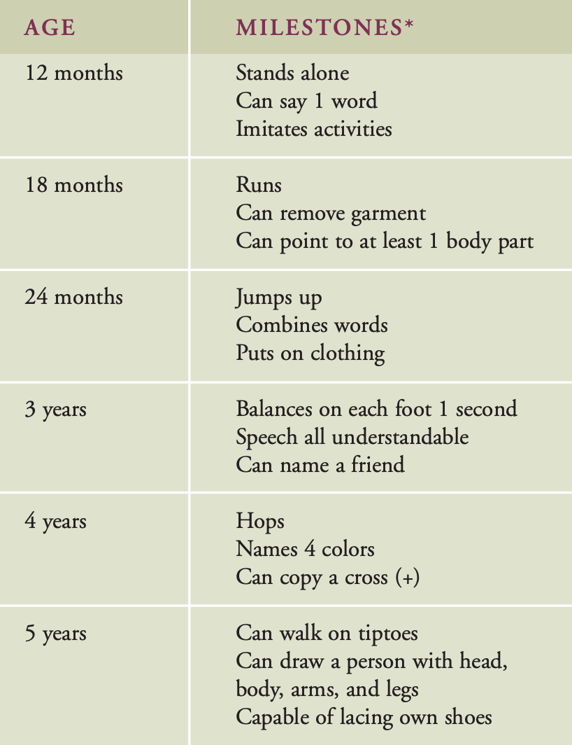 The Milestone Chart was adapted from Hagan JF, Shaw JS, Duncan PM, eds. 2008. Bright Futures: Guidelines For Health Supervision of Infants, Children, and Adolescents, Third Edition, Elk Grove Village, IL: American Academy of Pediatrics and Schor EL, ed. 2004. Caring For Your School-Age Child, New York: Bantam Books.