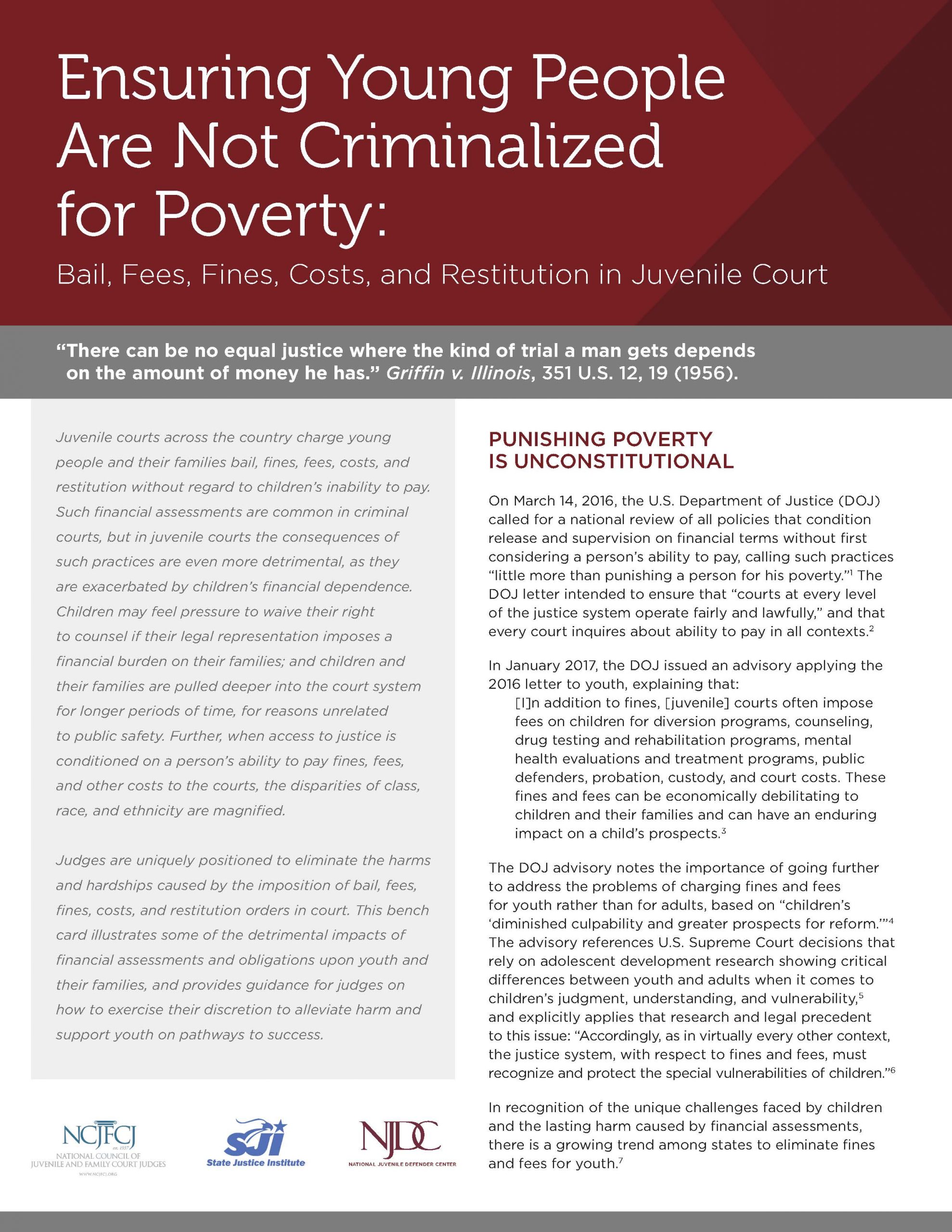 Judges are uniquely positioned to eliminate the harms and hardships caused by the imposition of bail, fees, fines, costs, and restitution orders in court. This bench card illustrates some of the detrimental impacts of financial assessments and obligations upon youth and their families, and provides guidance for judges on how to exercise their discretion to alleviate harm and support youth on pathways to success.