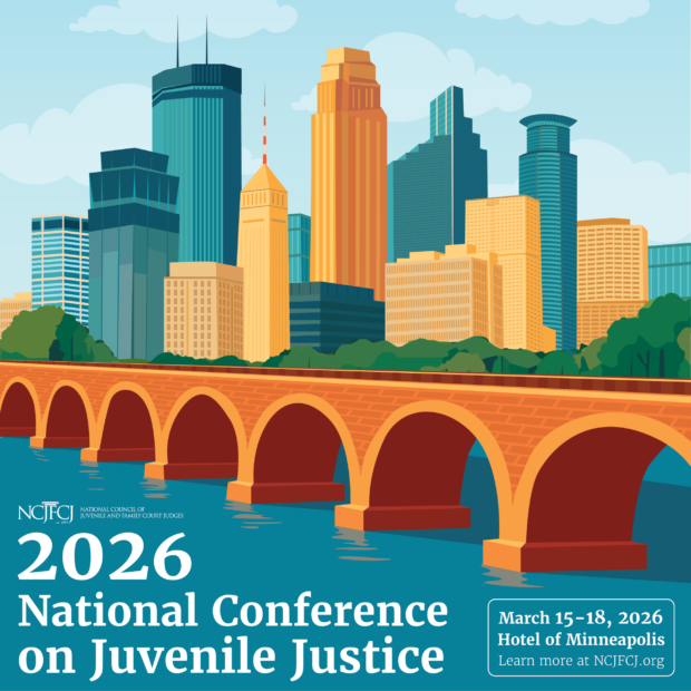 Register now for the for the 2026 National Conference on Juvenile Justice taking place March 15 – 18, 2026, in Minneapolis, Minnesota, at the Hyatt Regency Minneapolis. The conference will feature amazing presentations on current and cutting edge topics that will inspire you, broaden your knowledge, and provoke discussions about issues facing the juvenile and family court system.
