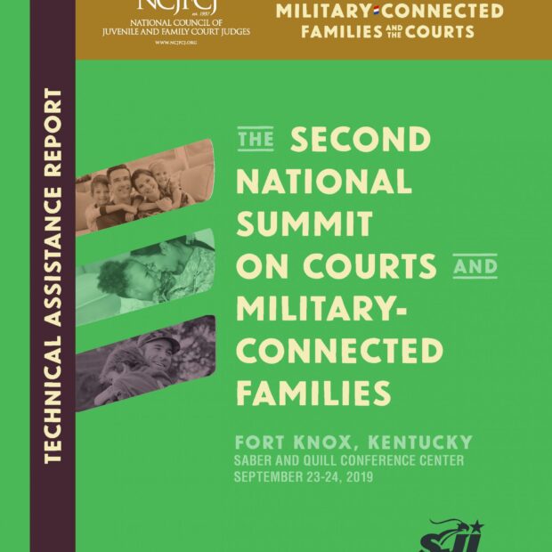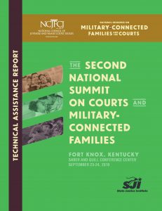 The NCJFCJ held the Second National Summit on Courts and Military-Connected Families (Summit) September 23-24, 2019, at the Saber and Quill Conference Center, Fort Knox, KY. The one-and-a-half-day Summit brought together members and staff of the military-related committees of the NCJFCJ, subject matter experts, representatives of national-level organizations that serve military-connected families, stakeholders with local and state government and nonprofit organizations, and members of the civilian and military communities of two demonstration sites selected for this State Justice Institute (SJI) funded project. The Summit’s purpose was to further the national discussion by those who engage with justice-involved service members, National Guard, Reserve, and veteran populations on how best to assist them when they interface with juvenile and family courts. The 2019 Summit sought to be a focused and targeted “deep dive” into the realities of the information and practices needed to promote effective court-military systems communication and collaboration.