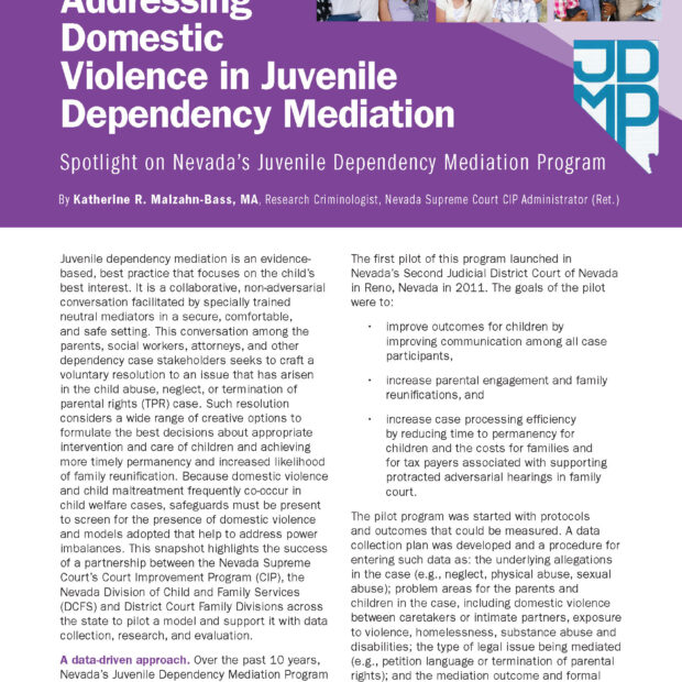 This snapshot highlights the success of a partnership between the Nevada Supreme Court’s Court Improvement Program (CIP), the Nevada Division of Child and Family Services (DCFS), and District Court Family Divisions across the state to pilot a model and support it with data collection, research, and evaluation.