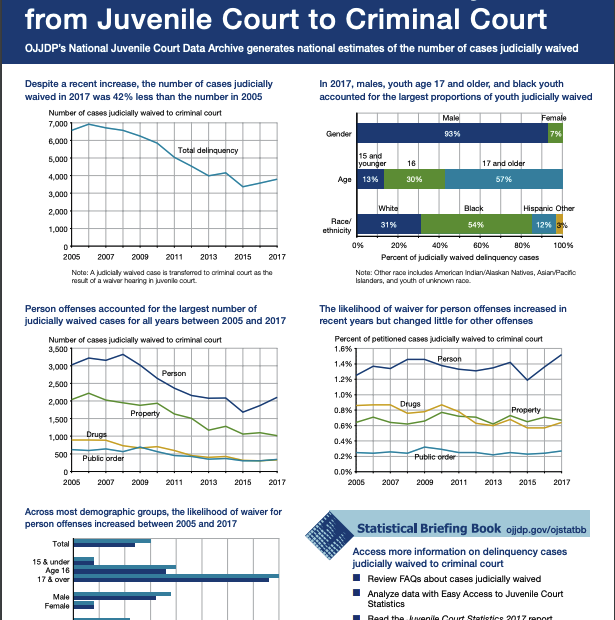 NCJJ and OJJDP’s Data Snapshot series helps disseminate current research about youth in the juvenile justice system. Each one-page Snapshot focuses on a specific topic (e.g., juveniles in residential placement, characteristics of youth residential placement facilities, youth victims of violence) and highlights policy-relevant findings. This Data Snapshot draws on data from the National Juvenile Court Data Archive to highlight the characteristics of cases judicially waived from juvenile to criminal court in 2021.