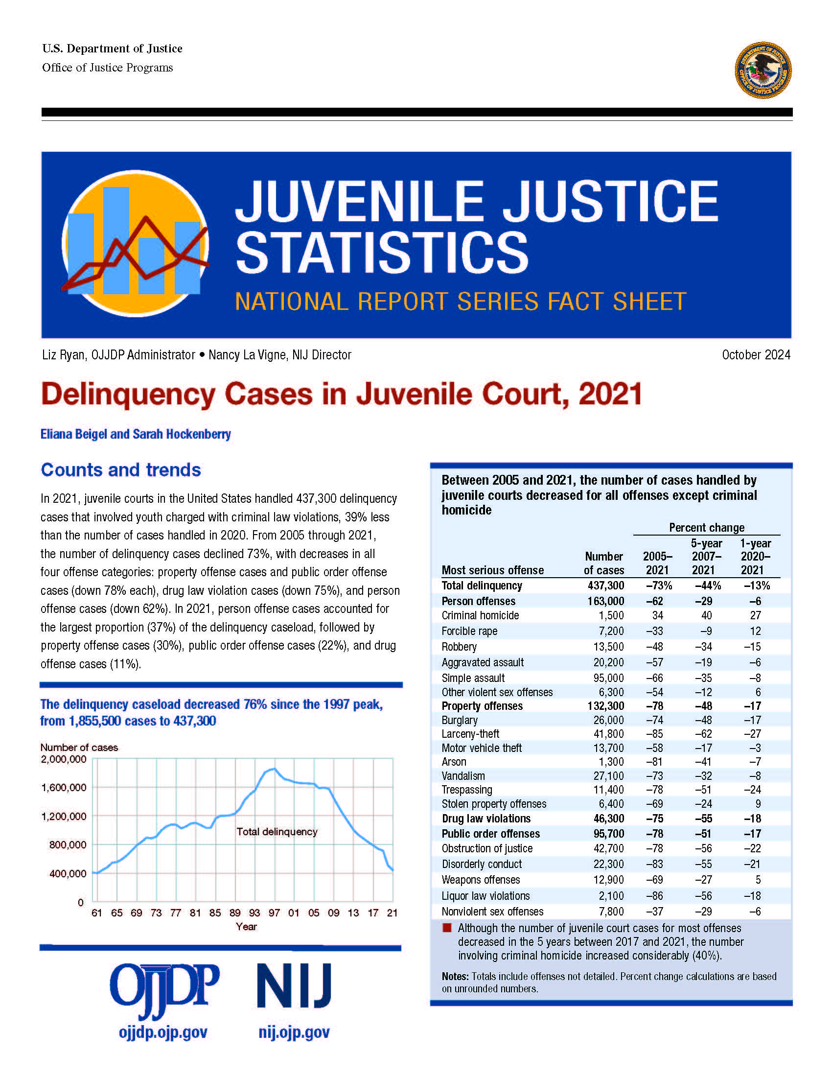 In 2021, juvenile courts in the United States handled 437,300 delinquency cases that involved youth charged with criminal law violations, 13% less than the number of cases handled in 2020. From 2005 through 2021, the number of delinquency cases declined 73%, with decreases in all four offense categories: property offense cases and public order offense cases (down 78% each), drug law violation cases (down 75%), and person offense cases (down 62%). In 2021, person offense cases accounted for the largest proportion (37%) of the delinquency caseload, followed by property offense cases (30%), public order offense cases (22%), and drug offense cases (11%).