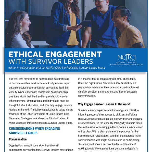 It is vital that any efforts to address child sex trafficking in our communities include not only survivor input but also opportunities for survivors to lead the work. Organizations and individuals must be thoughtful about why, when, and how they engage survivor leaders in the work. This tip sheet, developed in collaboration with a Survivor Leader Board, provides guidance on why, when, and how Survivor Leaders should be engaged.