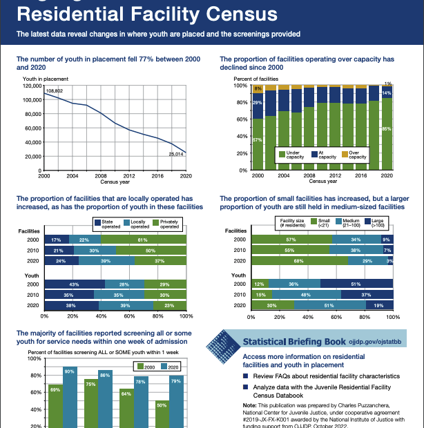 This data snapshot draws on data from OJJDP’s Juvenile Residential Facility Census to describe changes in where youth are placed and services provided. Data shows that the number of youth in placement fell by 77 percent between 2000 and 2020. The proportion of facilities that are locally operated has increased, as has the proportion of youth in these facilities. The majority of facilities reported screening all or some of youth for service needs within one week of admission. The proportion of facilities operating over capacity has declined since 2000. The proportion of small facilities has increased, but a larger proportion of youth are still held in medium-sized facilities.