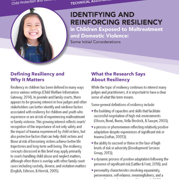 This is the first in a series of technical assistance briefs on resiliency by the Resource Center on Domestic Violence: Child Protection and Custody, a project of the NCJFCJ. This brief focuses on clarifying and refining the concept of resiliency, provides an overview of the research on this important topic, and offers some initial considerations as courts attempt to further reinforce resiliency in applicable cases.