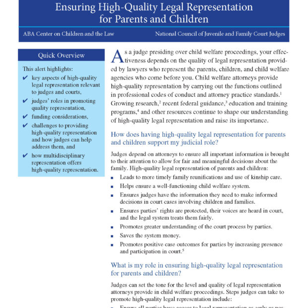 - challenges to providing high-quality representation and how judges can help address them; and