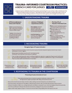 The NCJFCJ, in partnership with OurFamilyWizard, has released Trauma-Informed Courtroom Practices: A Bench Card for Judges, designed to support judges in making informed decisions when working with children and families affected by trauma. The bench card and supplemental Q&A can be downloaded here: